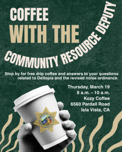 This informal event provides an opportunity for residents, students, and local business owners to meet with Deputy Morrell and Lieutenant Schmidt, ask questions, share concerns, and learn more about public safety efforts in Isla Vista. Deputy Morrell and Lieutenant Schmidt will also answer questions related to Deltopia and the revised noise ordinance.